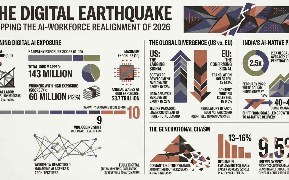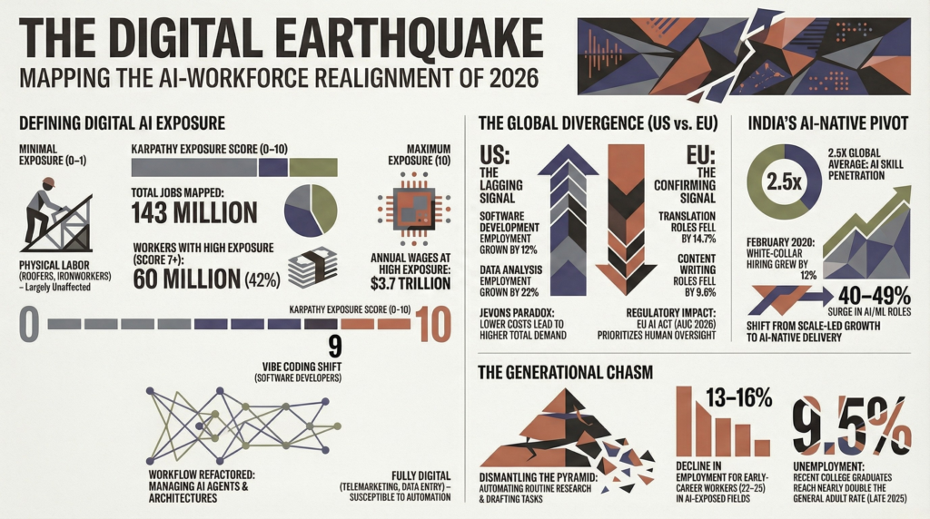 By utilizing large language models to score the Bureau of Labor Statistics (BLS) data, this framework provides a high-resolution map of the workforce. Approximately 42% of the US workforce—nearly 60 million workers—now holds an exposure score of 7 or higher, representing $3.7 trillion in annual wages. But as we look across the globe, the impact of this “digital earthquake” is manifesting in vastly different ways.